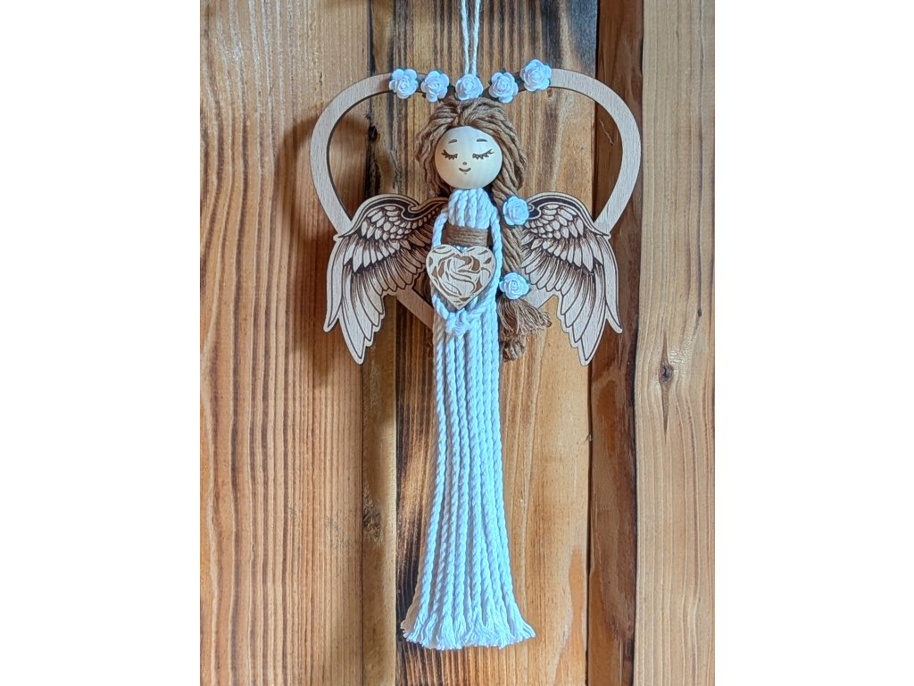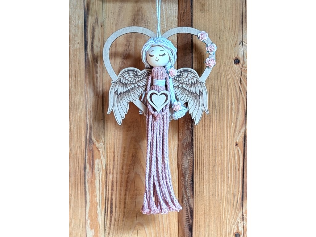 Anděl dekorace, macramé andělka, dřevo, srdce