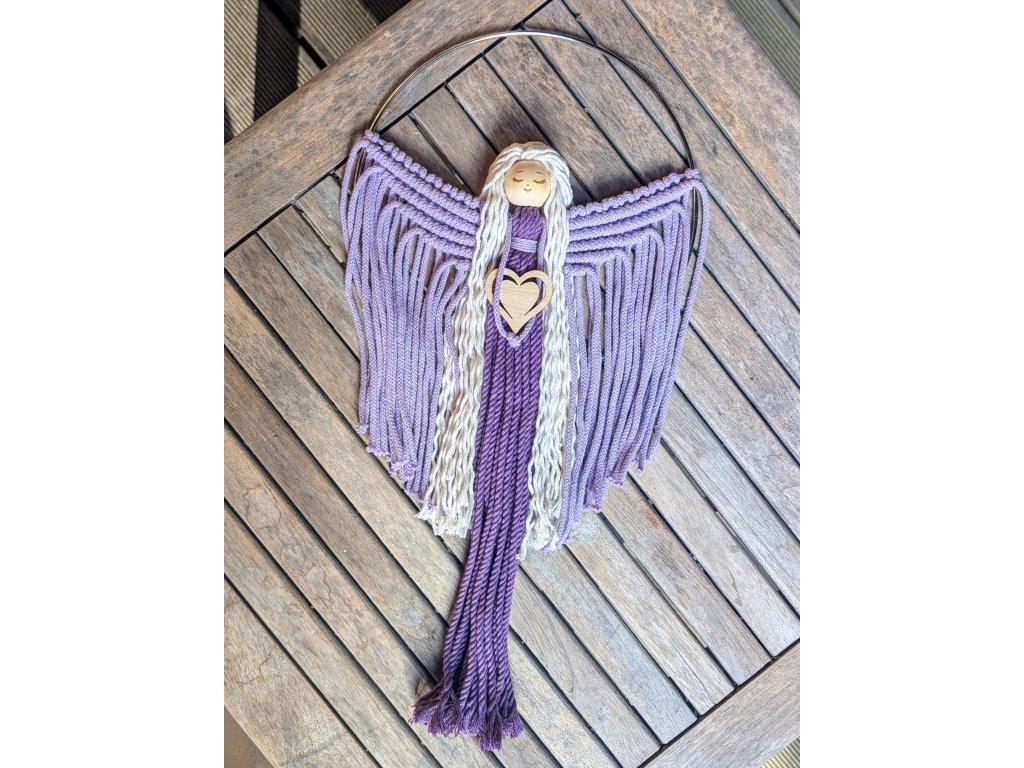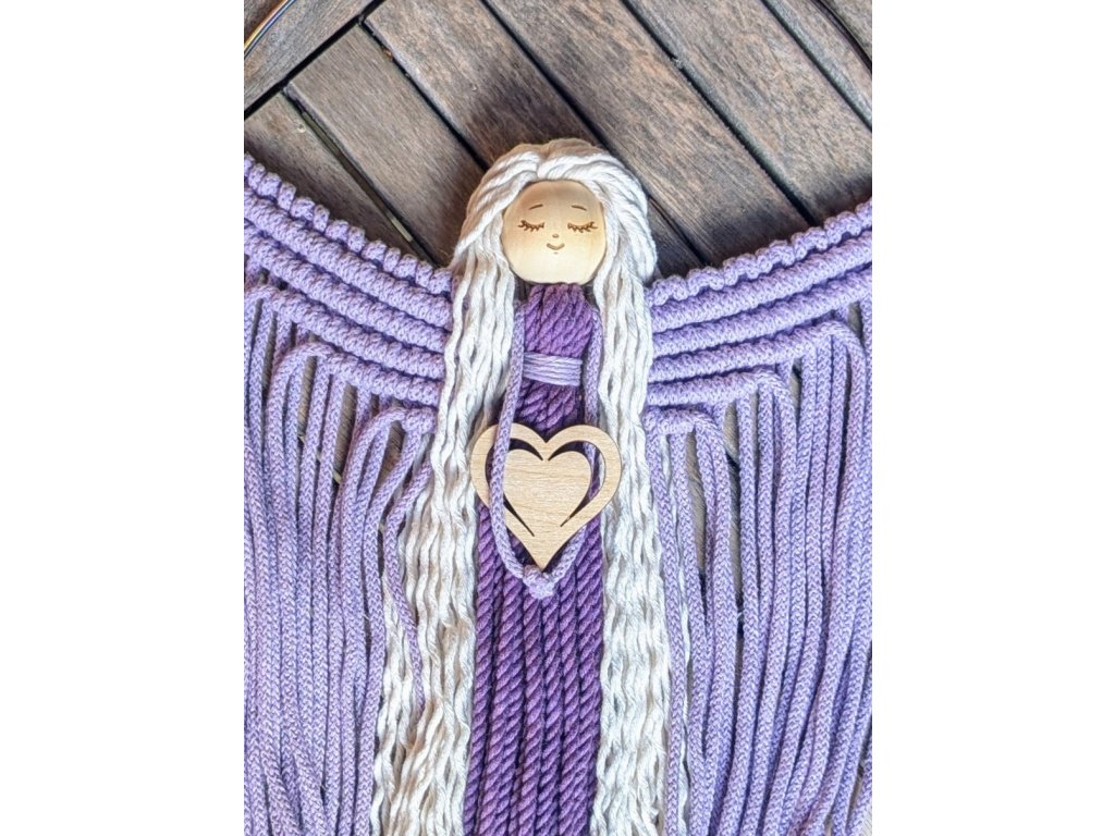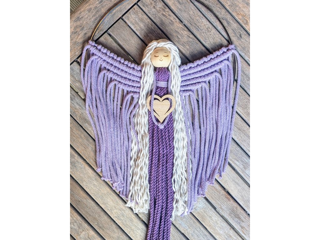 Macramé andělka na kovovém kruhu, fialová / bílá