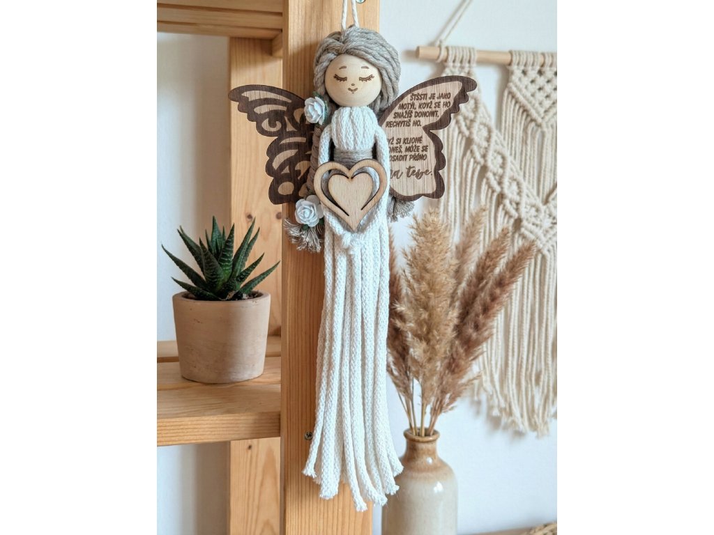 Macrame andělka s dřevěnými křídly s textem.