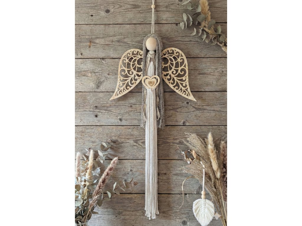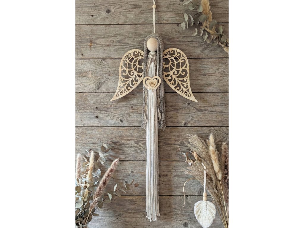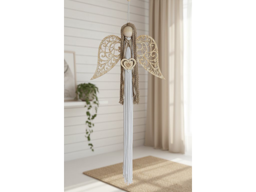 Anděl s dřevěnými křídly v přírodních barvách.