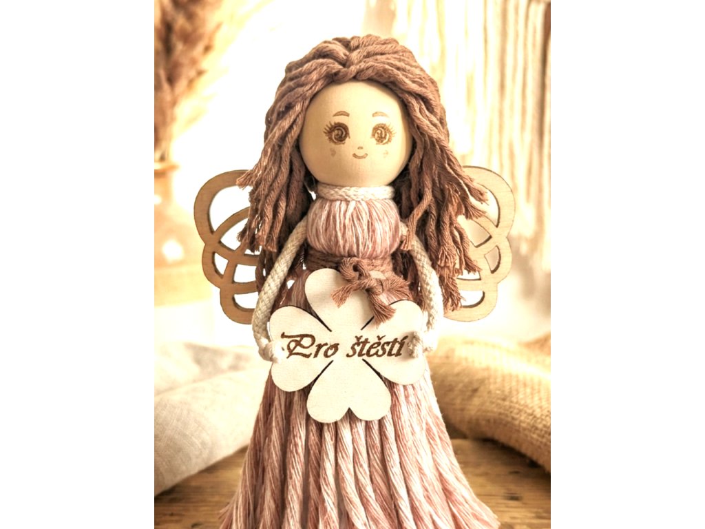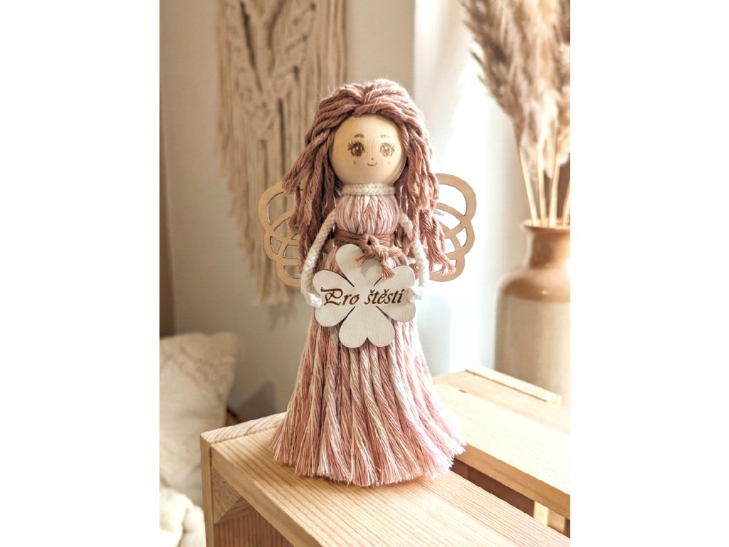Andělka v přírodních barvách v růžových šatech s dřevěnými křídly.