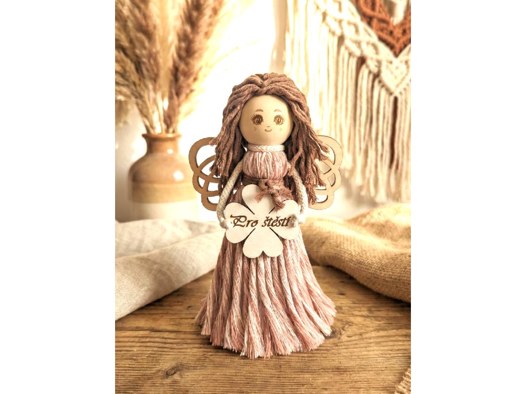 Stojící andělka, macramé anděl, přírodní dekorace, křídla dřevo