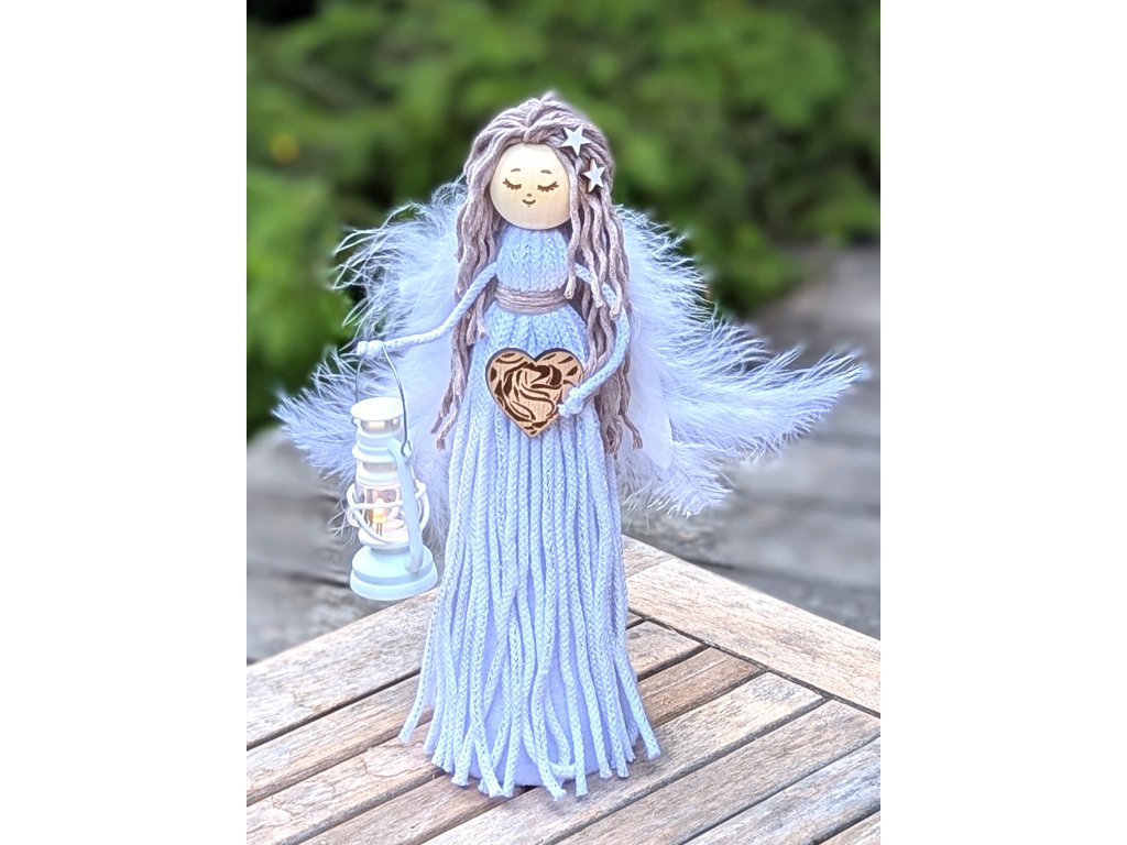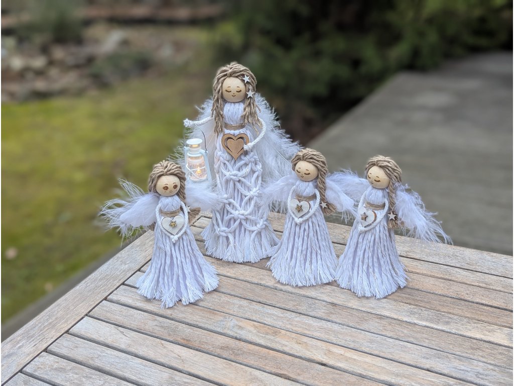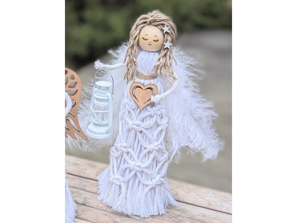Stojící andělka, macramé anděl, přírodní dekorace, křídla peří
