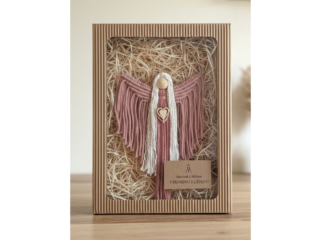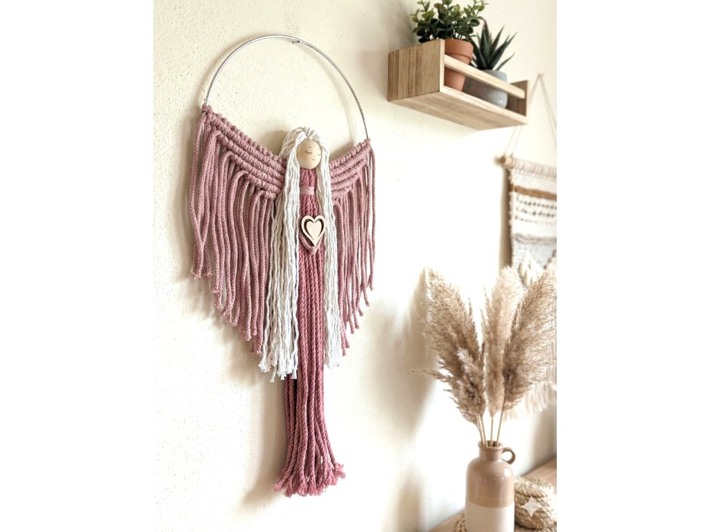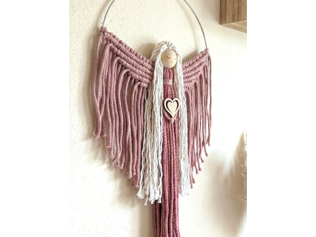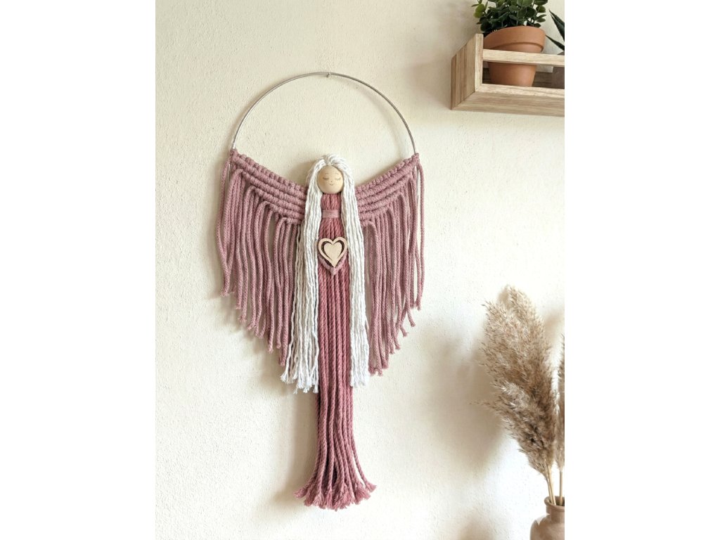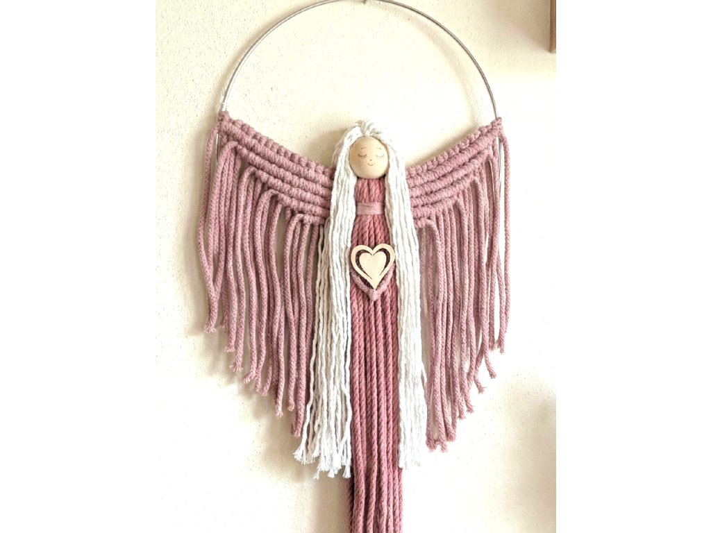 Macramé andělka na kovovém kruhu, růžová / bílá
