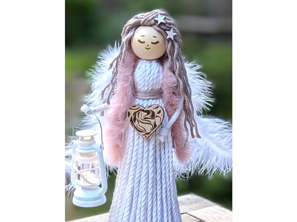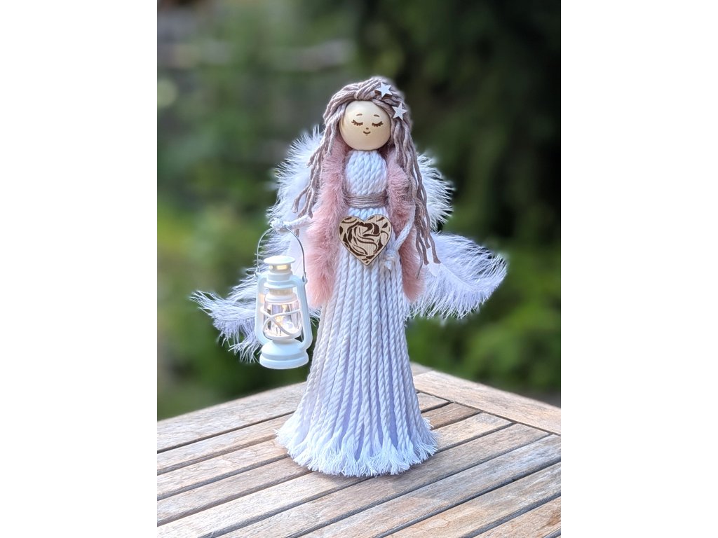 Stojící andělka, macramé anděl, dekorace bílá, křídla peří