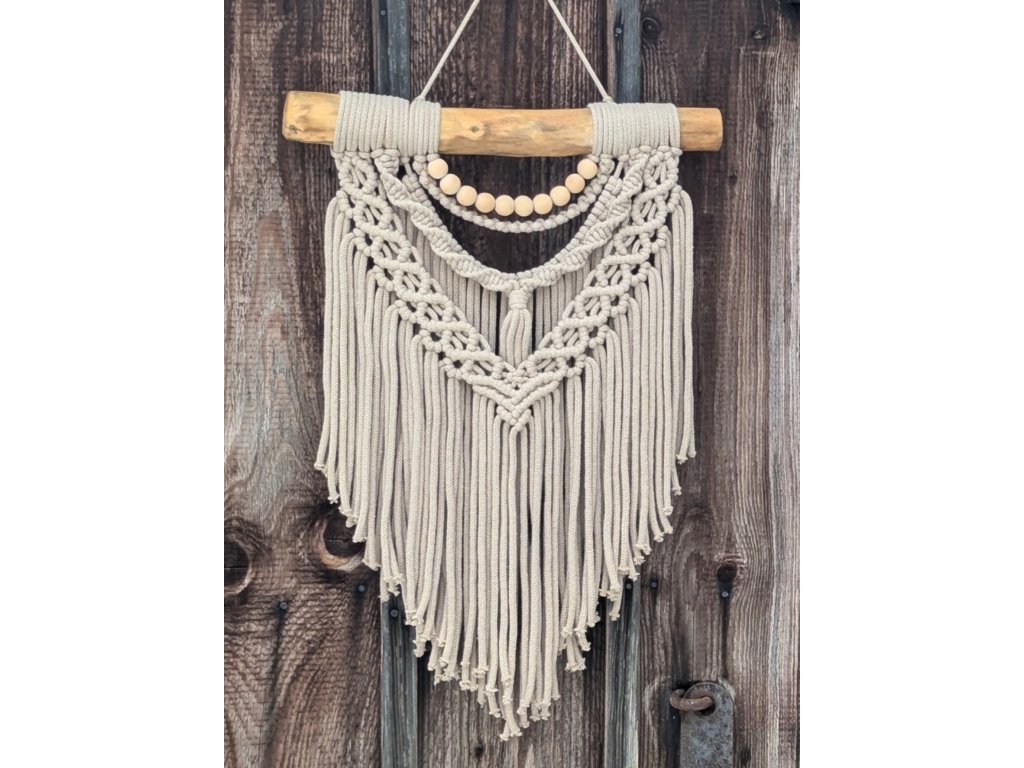 Dekorace je upevněné na masivní dřevěné větvi a ozdobená dřevěnými korálky.
