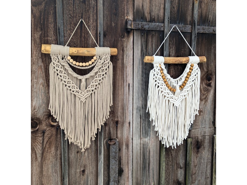Nástěnná dekorace vyrobená technikou macramé v kávové barvě.