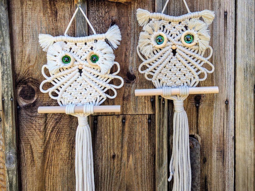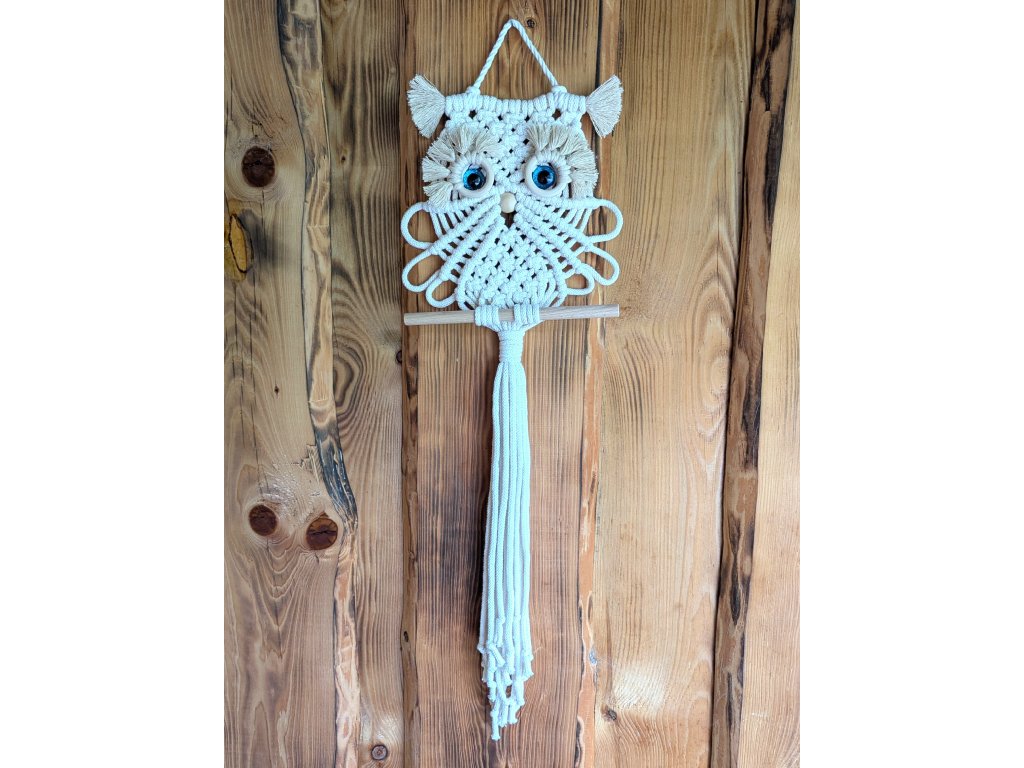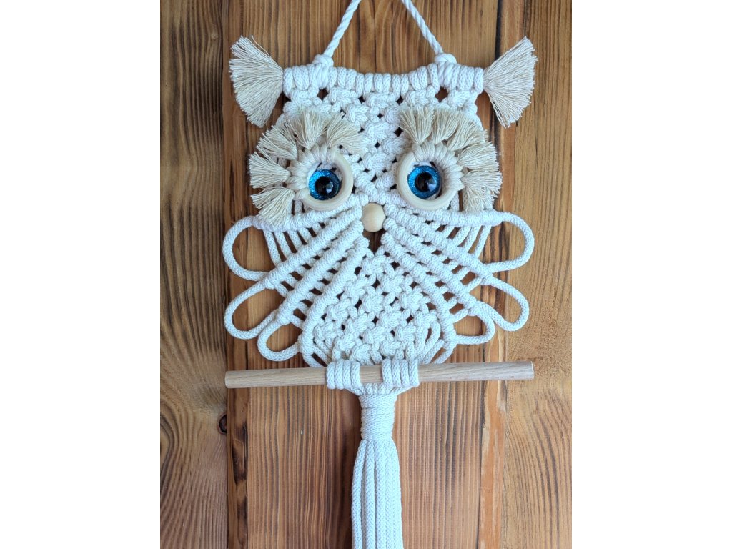 Sova je vyrobená z bavlněné příze a dřevěných komponentů, oči plast.