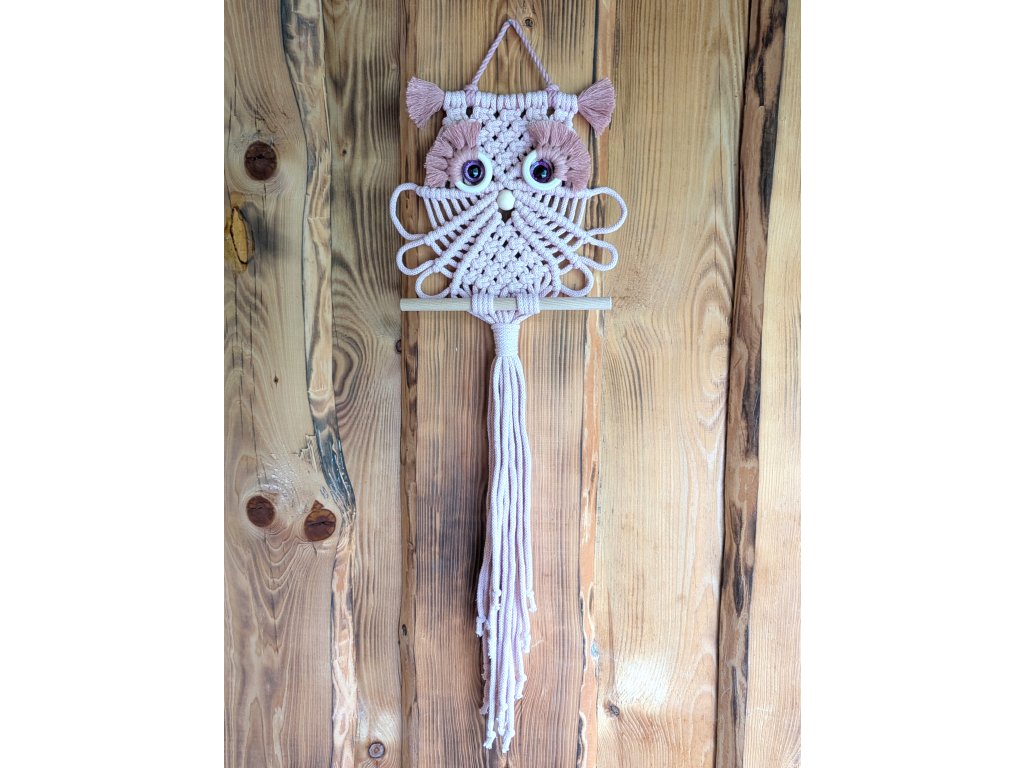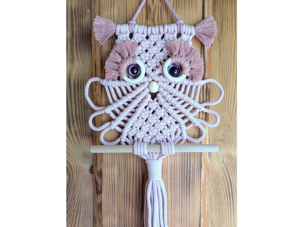 Sova je vyrobená z bavlněné příze a dřevěných komponentů, oči plast.