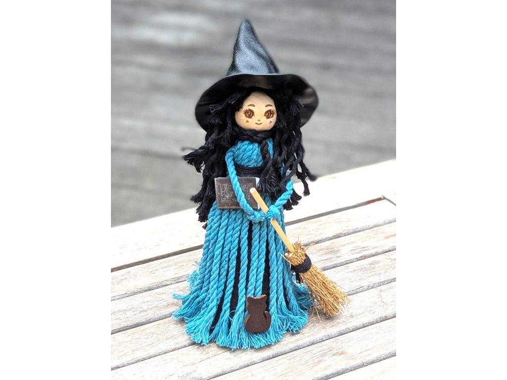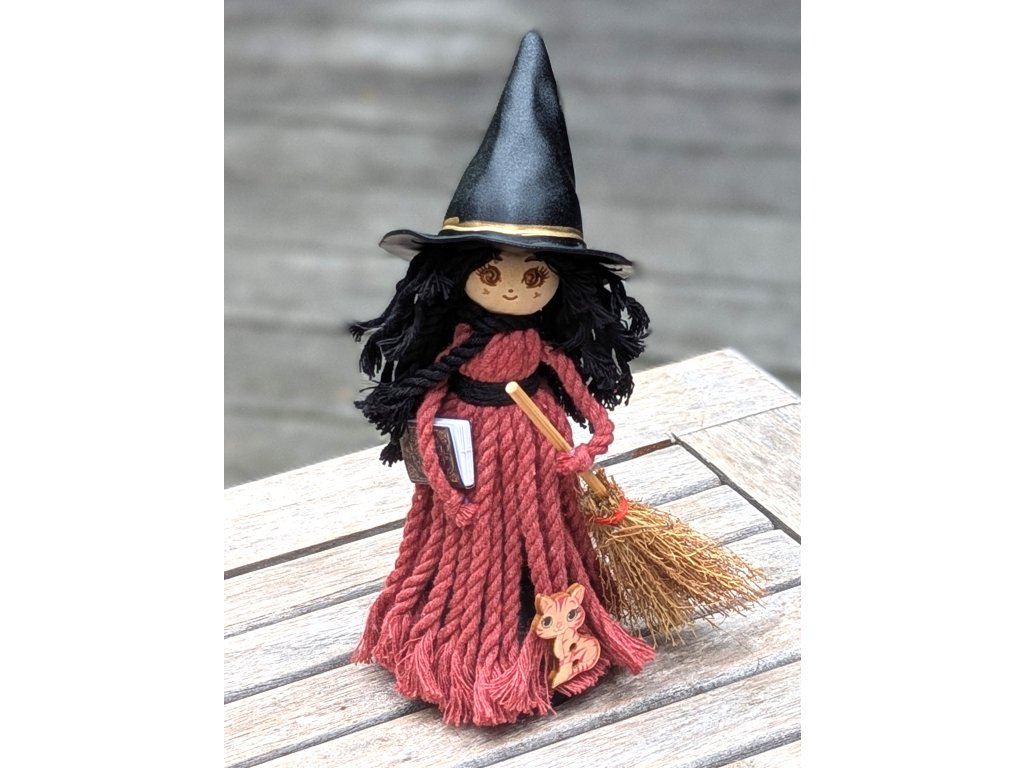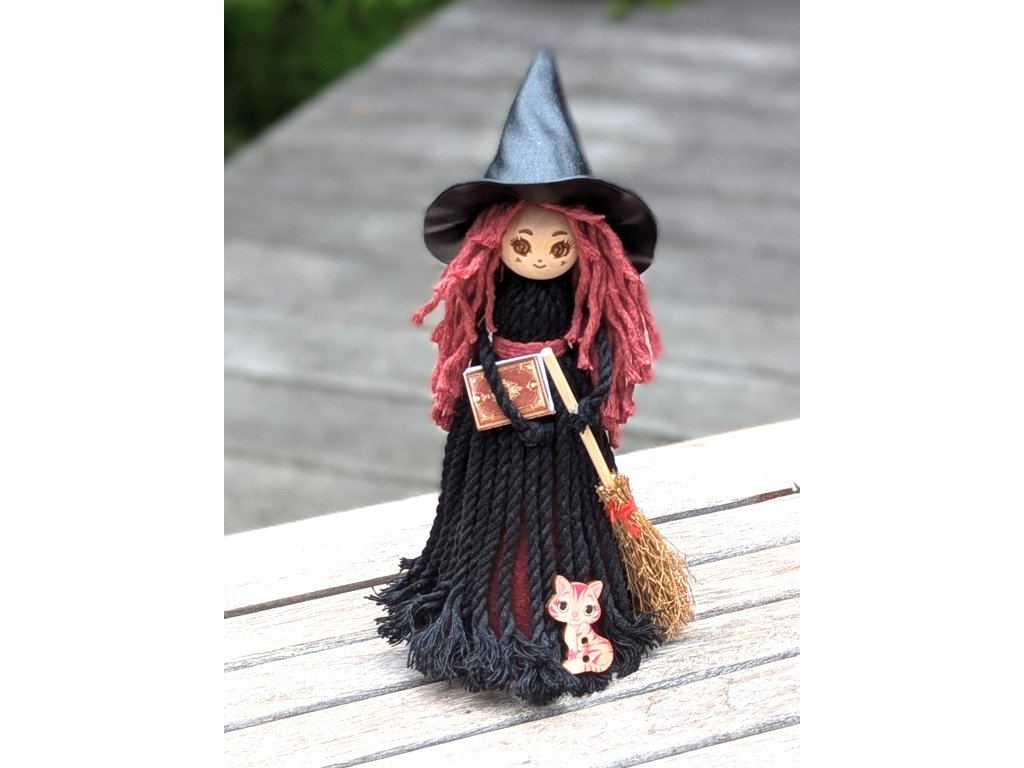 Čarodějnice je vyrobená z bavlněné příze, textílií a dřevěných komponentů.