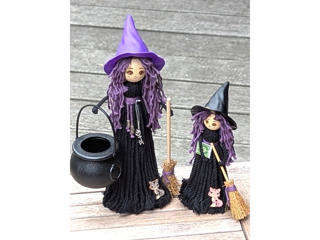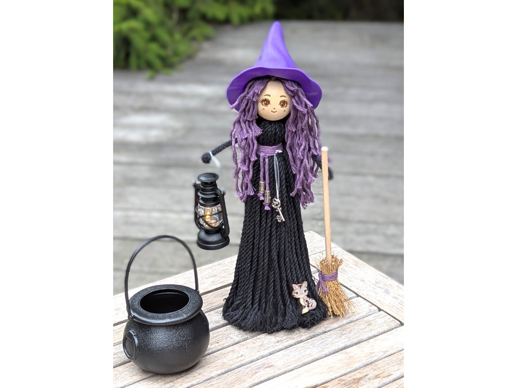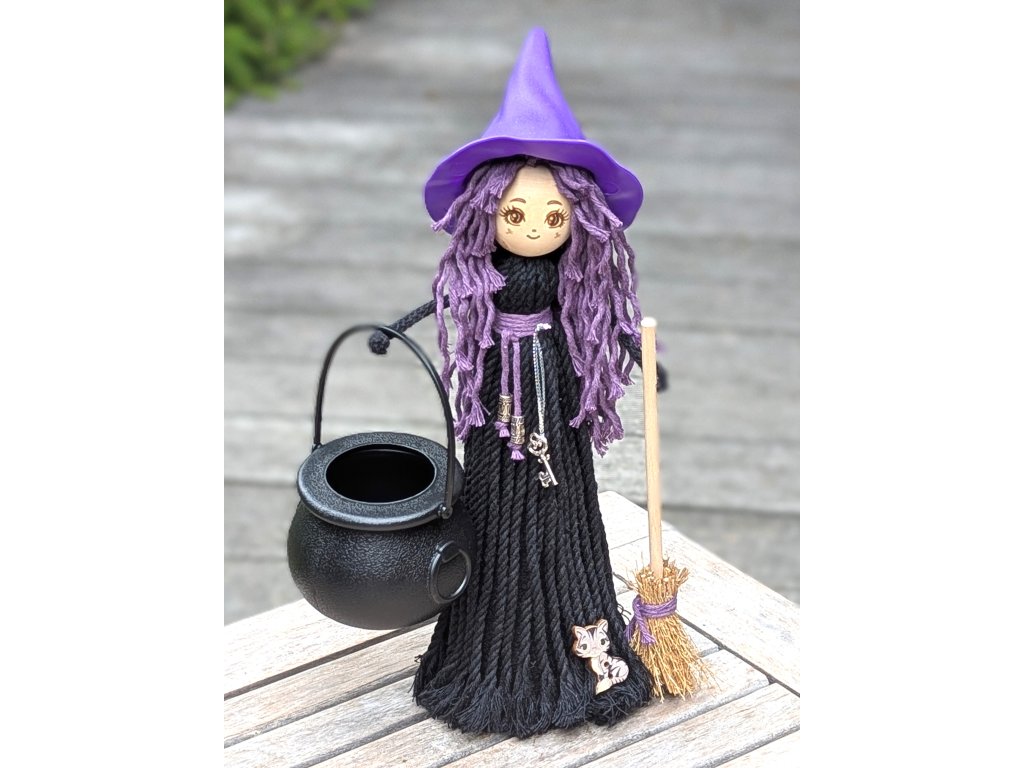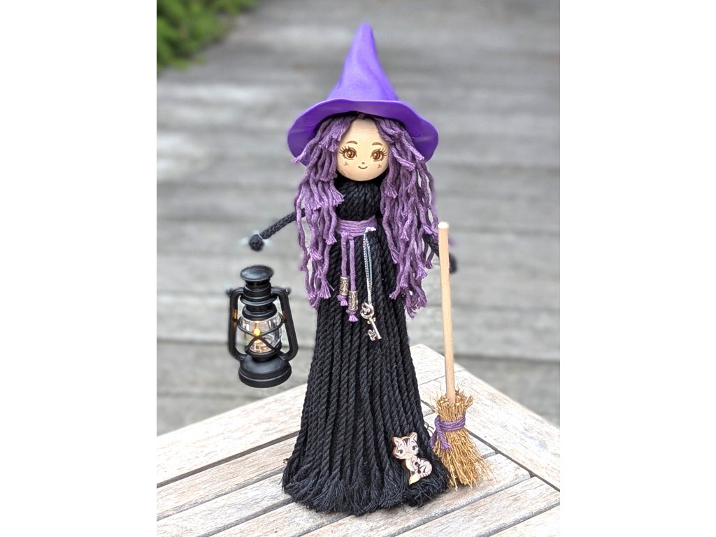 Čarodějnice je vyrobená z bavlněné příze, textílií a dřevěných komponentů.