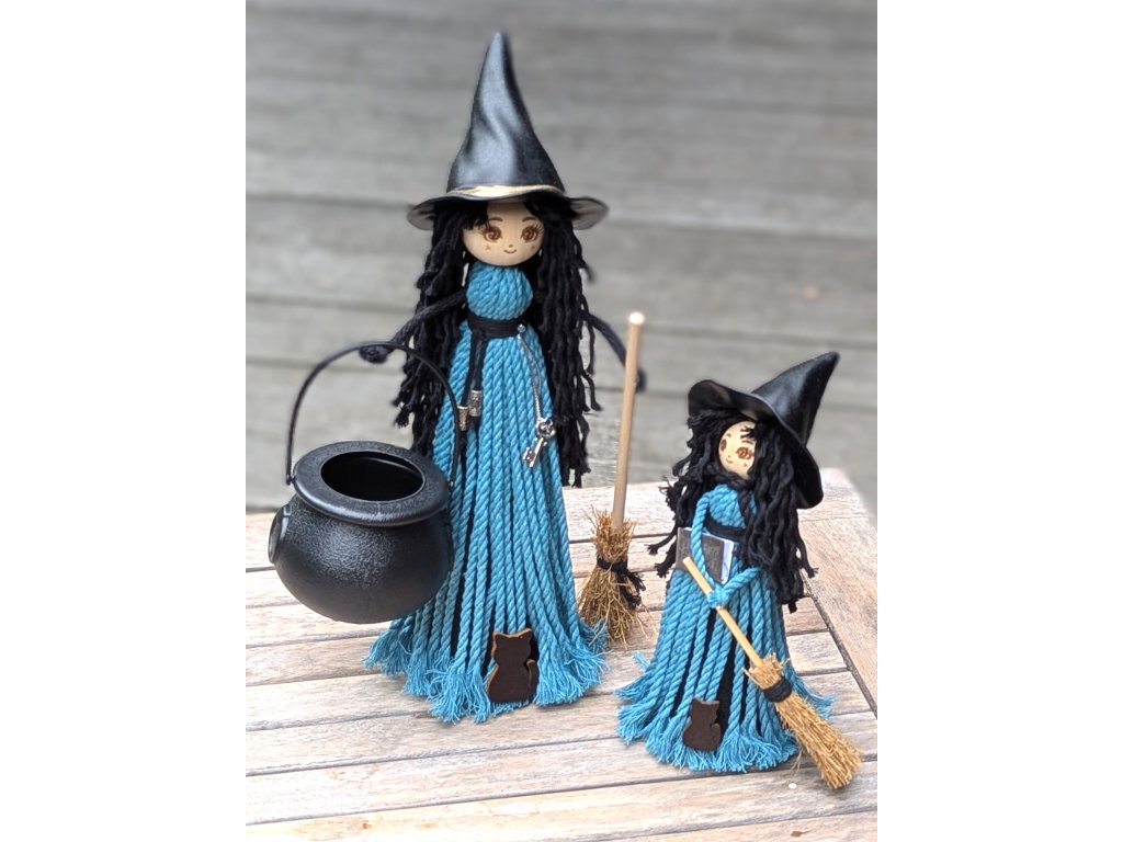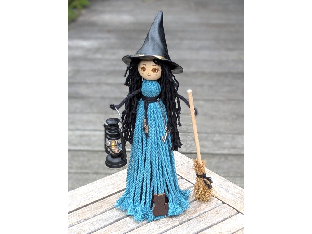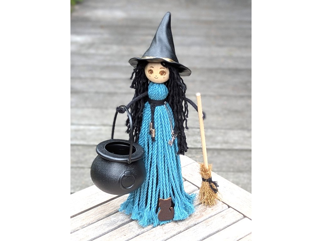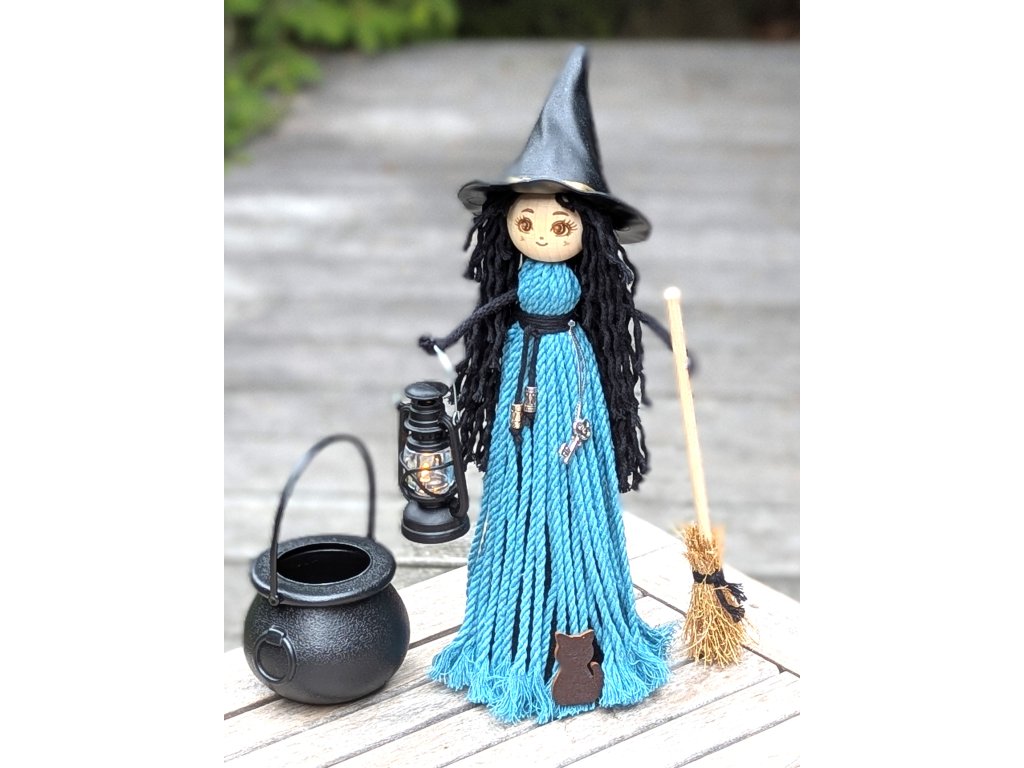 Čarodějnice je vyrobená z bavlněné příze, textílií a dřevěných komponentů.