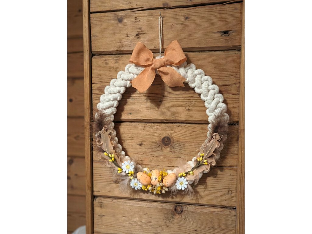 Průměr věnce je 25 cm Věnec je vytvořený macramé technikou z bavlněné příze, dozdobený je peřím, umělými květinami, polystyrenovými vajíčky, bavlněnou mašlí a dalšími doplňky.